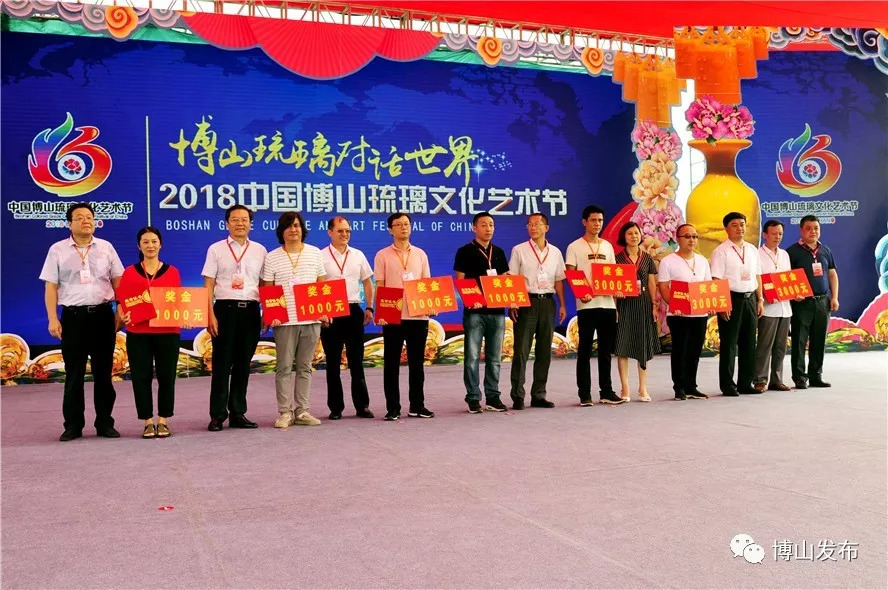 開幕式上,孟令彥、張鐵柱、馬曉磊、畢榮青、劉忠遠共同推動啟動桿,宣布2018中國博山琉璃文化藝術節開幕。與會領導為博山榮獲“國家文化出口基地”揭牌,為“最美是琉璃”全國中學生地理標志征文大賽獲獎選手和2018中國(博山)國際琉璃藝術創新設計大賽獲獎選手頒獎。